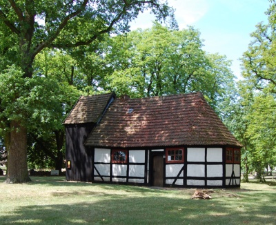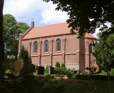 Die Kirche ist ein im Jahr 1831 renovierter Fachwerkbau und stellt einen ungeteilten und flach gedeckten Raum dar, der im Osten aus dem Achteck geschlossen ist und von stillosen viereckigen Fenstern erleuchtet wird. Sie hat keinen Turm, statt dessen steht ein hölzerner Glockenturm mit einer Glocke auf dem Kirchhof. Erst nach 1968 wurden umfangreiche Erhaltungsmaßnahmen durchgeführt wie: Erneuerung von Fenster, Türen und Fußboden, das komplette Dach und der Dachstuhl. Die Einrichtung der Kirche bietet zu Bemerkungen keinen Anlass, jedoch fällt auf, dass auf dem Altar neben einem Krucifixus zwei andere aus Holz geschnitzte, ungefähr 1 m hohe Figuren aufgestellt sind, welche einem alten gothischen Triptychon entnommen zu sein scheinen, nämlich der Evangelist Johannes mit dem Kelch und die heilige Maria mit dem Kinde.
